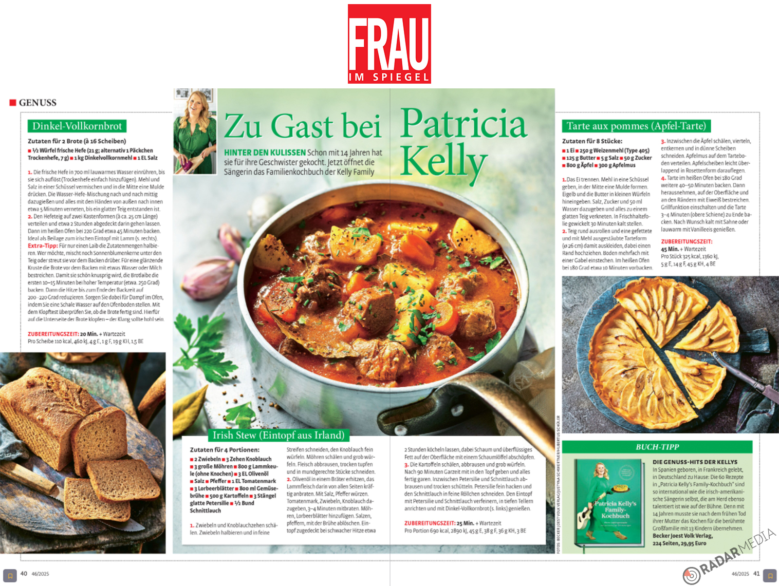 Das Buch vereint Patricias liebste Familienrezepte : oft landestypische Klassiker wie das Irish Stew, die spanische Tortilla, die französische Apfeltarte oder die berühmten französischen Saucen. Dazu der geliebte deutsche Käsekuchen und international beliebte Gerichte wie Burger, Schnitzel und Gulasch – alle authentisch und gelingsicher. Dazu kommen die ganz eigenen Kelly-Style-Rezepte , zum Beispiel für Brot, Müsli und Bratkartoffeln.
