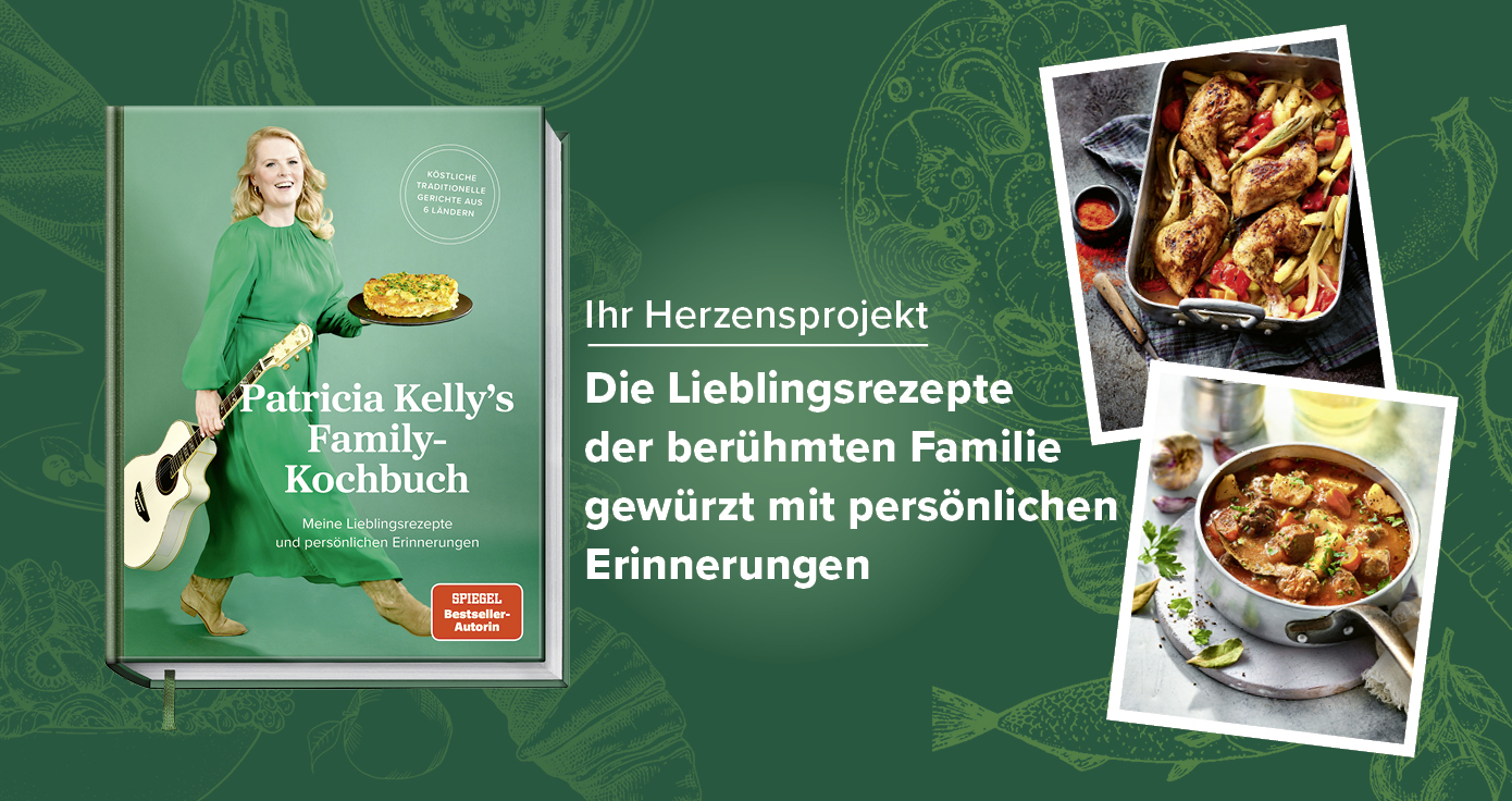 Buchcover „Patricia Kelly’s Family-Kochbuch“ mit Autorin in grünem Kleid und einer Quiche.